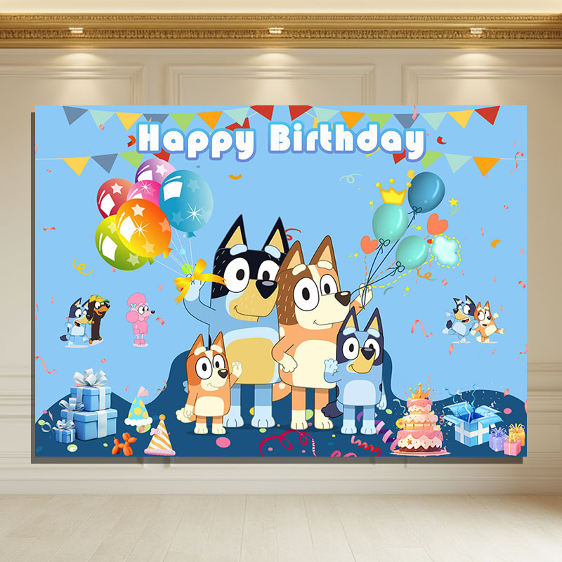 Layoris Bluey Cartoon Dog Balloons Happy Birthday Backdrop