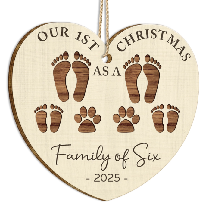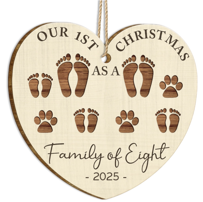 Create a cherished keepsake with this unique custom-shaped wooden ornament, designed to capture your family's first Christmas together. Its meaningful design features adorable footprints, symbolizing the bond and love within your family. Perfect for hanging on the Christmas tree or displaying in your home, this ornament adds a touch of joy and warmth to your holiday decorations.