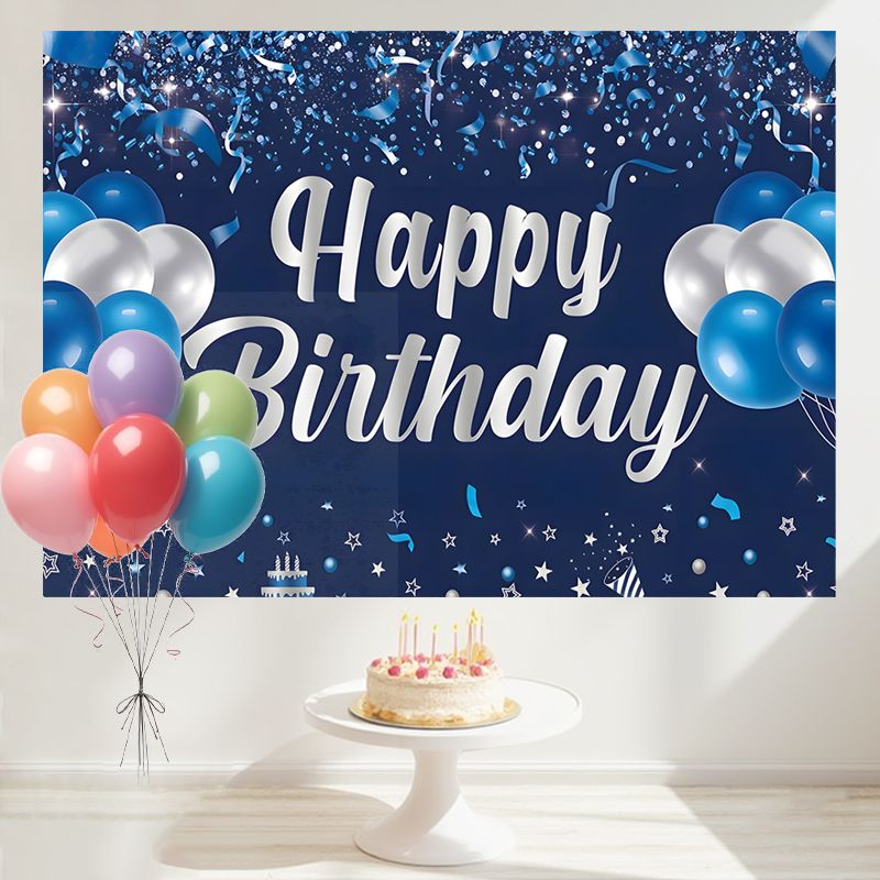 Layoris Blue Balloons Ribbon Happy Birthday Backdrop