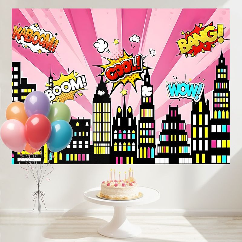 Layoris Pink Cartoon Super City Backdrop For Birthday Party
