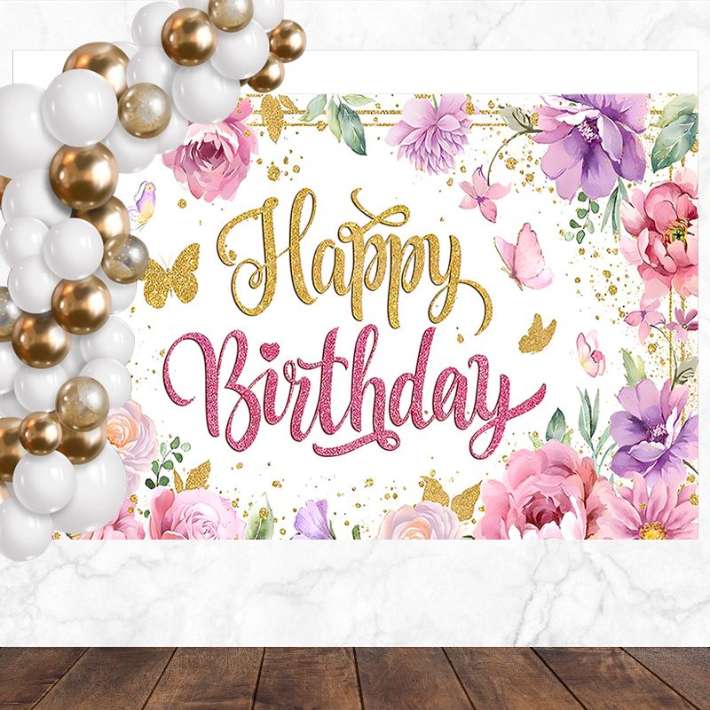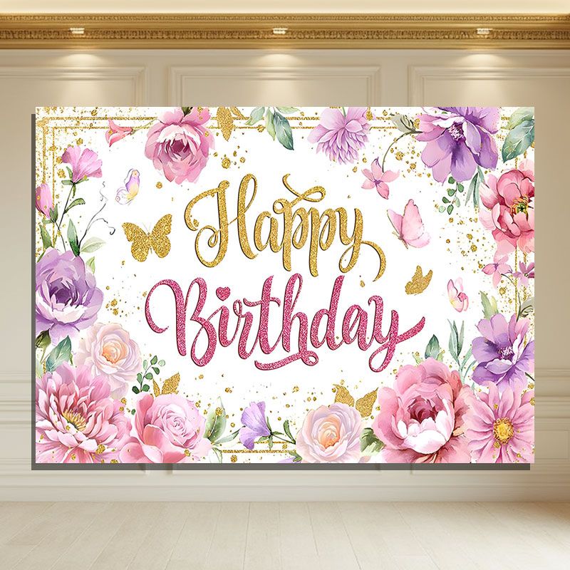 Layoris Pink Floral Purple Flower Glitters Birthday Banner