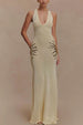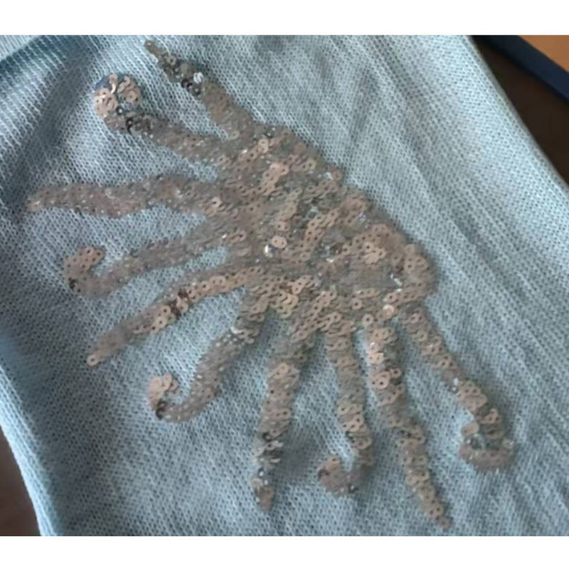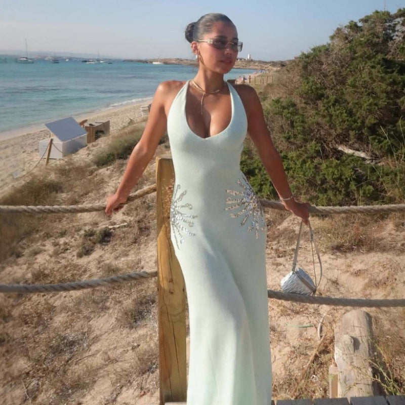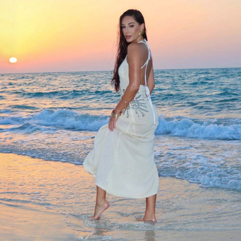 Perfect for sunny escapes and glittering evenings, this knit maxi dress features a relaxed yet radiant silhouette adorned with sequins. The V-neckline and crisscross back straps highlight its open-back design, while the soft, unlined knit fabric drapes gracefully over the body. Sparkling sunburst sequins at the hip lend a touch of glamour to this effortlessly chic piece. Ideal for vacations, sunset dinners, or seaside strolls.